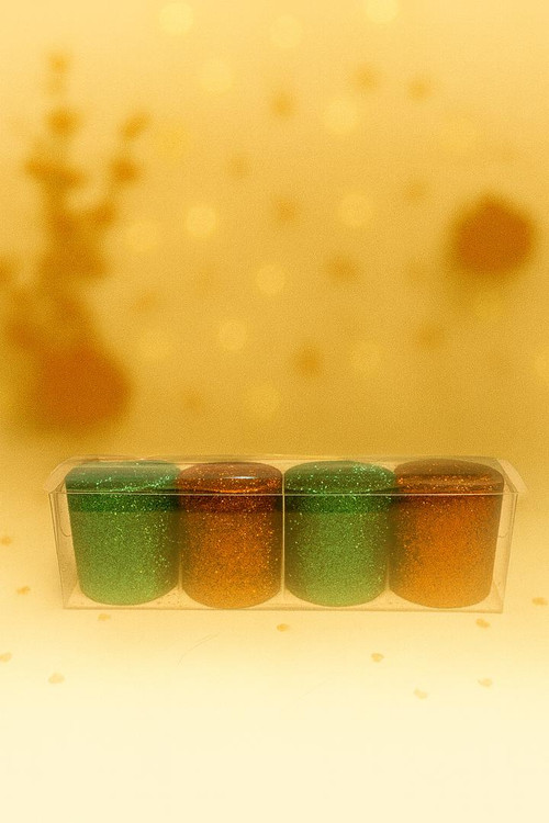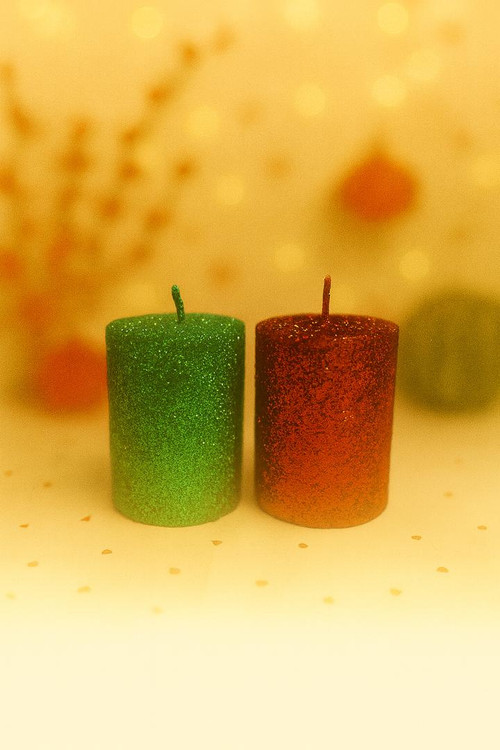 **ست شمع اکلیلی یلدایی** شامل دو شمع استوانهای در دو رنگ اصلی جشن شب یلدا: سبز و قرمز. سطح این شمعها با اکلیلهای ریز و درخشان پوشیده شده تا جلوهای جذاب، فانتزی و کاملاً مناسب جشنها داشته باشند.