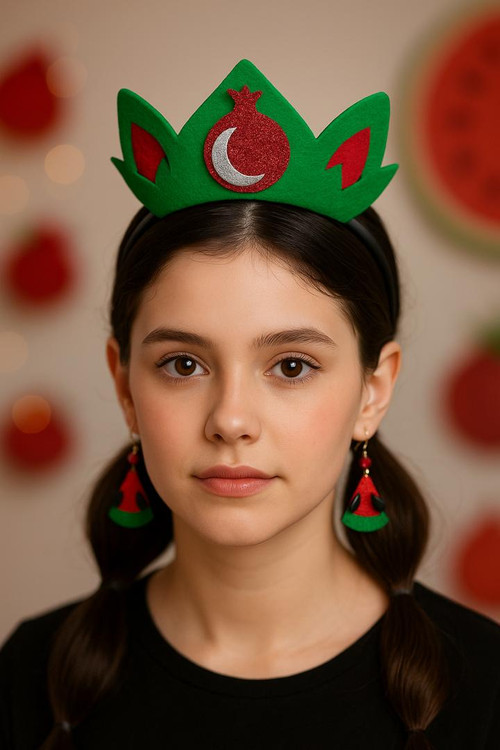 **تل یلدایی طرح انار** یک اکسسوری جذاب، سبک و دوستداشتنی برای جشنها و مراسم شب یلداست. ترکیب رنگ سبز و قرمز نماد شب یلداست و طرح انار اکلیلی همراه با هلال ماه، به تل جلوهای متفاوت و چشمگیر داده است.