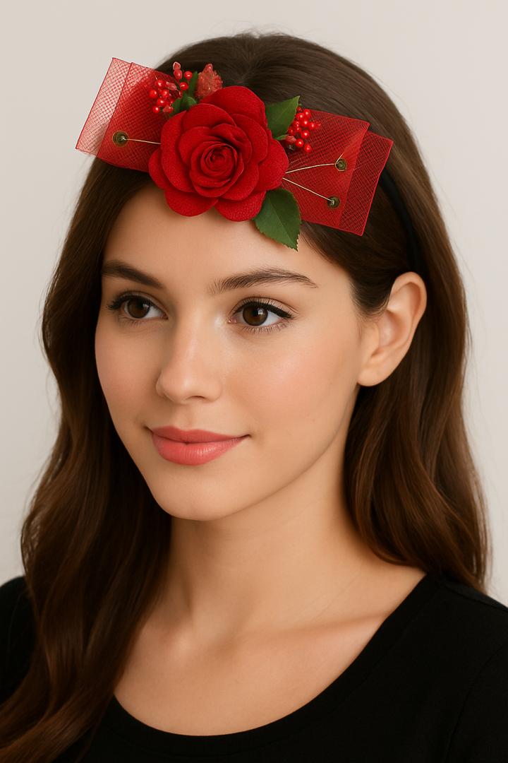 این هدبند یلدایی زیبا با طراحی گل رز قرمز و جزئیات برگ و مروارید، انتخابی جذاب و خاص برای دخترخانمها در جشن شب یلداست. رنگبندی قرمز و سبز هماهنگ با تم یلدایی، جلوهای شیک و هماهنگ با سایر اکسسوریها ایجاد میکند و در عکسها فوقالعاده چشمنواز است 🌺🎉