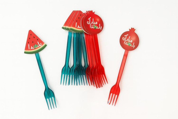 این چنگالهای یلدایی با طراحی بامزه و جذاب به شکل برش هندوانه و انار، انتخابی فوقالعاده برای تزئین میز پذیرایی شب یلدا هستند. نوشتهی زیبای «یلدا مبارک» روی طرح، حالوهوای مهمانی شما را کاملاً جشنوارهای میکند و جلوهای زیبا به میز تنقلات میبخشد.