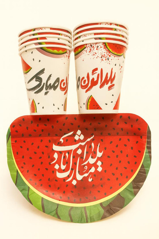 این ست جذاب شامل لیوانهای تم یلدایی به همراه پیشدستی طرح هندوانه است و یکی از پرطرفدارترین گزینهها برای پذیرایی شب یلدا به حساب میآید. طراحی چشمنواز هندوانهای و نوشتهی «یلدا مبارک» روی هر دو محصول، جلوهای بسیار هماهنگ و شیک روی میز پذیرایی ایجاد میکند و عکسهای یادگاری شما را زیباتر خواهد کرد.