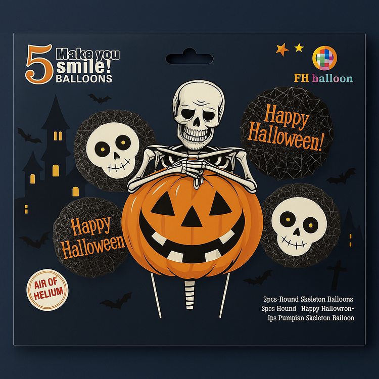 ترکیب اسکلت خندان با کدو نارنجی و بادکنکهای گرد مشکی، جلوهای حرفهای و ترسناک به فضای جشن میده.